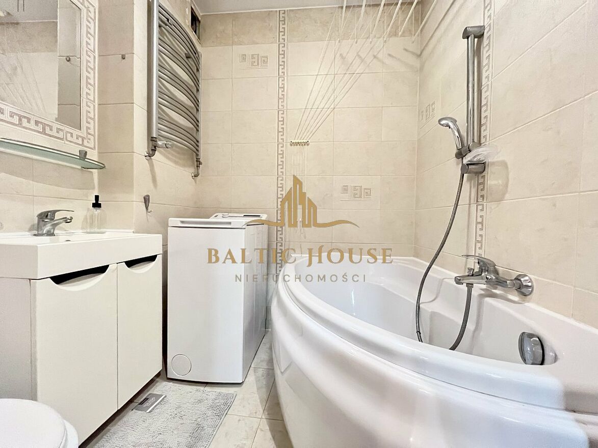 Wyposażona w wannę oraz pralkę, co zapewnia wygodę w codziennych obowiązkach.